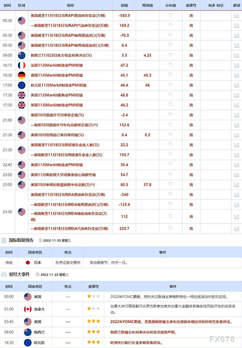 经济事件方面,NYMEX纽约原油12月期货受移仓换月影响11月22日3:30完成场内最后交易,凌晨6:00完成电子盘最后交易,请留意交易场所到期换月公告控制风险。此外,部分交易平台美油合约到期时间通常较NYMEX官方提前一天,请多加留意。