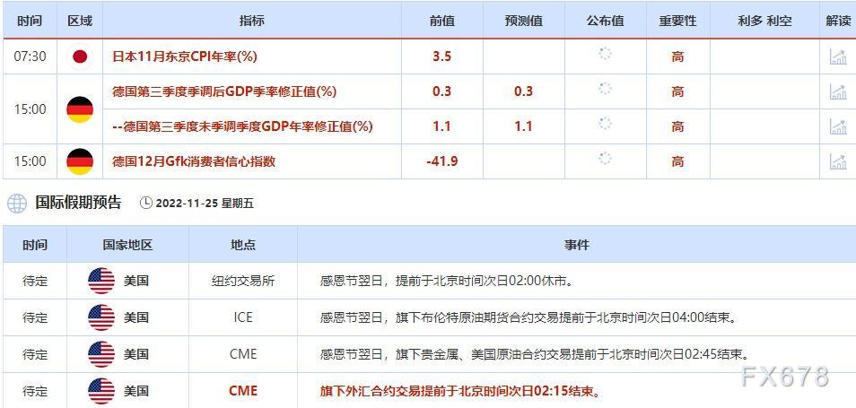 投资者还需关注感恩节期间美国各大交易所的休市公告:美股休市一日;美国ICE旗下布伦特原油期货合约交易提前于北京时间次日02:30结束;美国CME旗下贵金属、美国原油合约交易提前于北京时间次日03:30结束。
