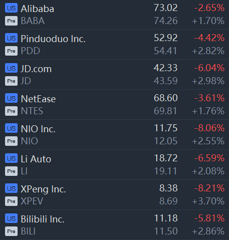 Hot chinese ADRs climbed in premarket trading. Alibaba rose 1.7%; Pinduoduo and JD.com rose nearly 3%; NIO and Li Auto rose more than 2%; Xpeng rose 3.7%.