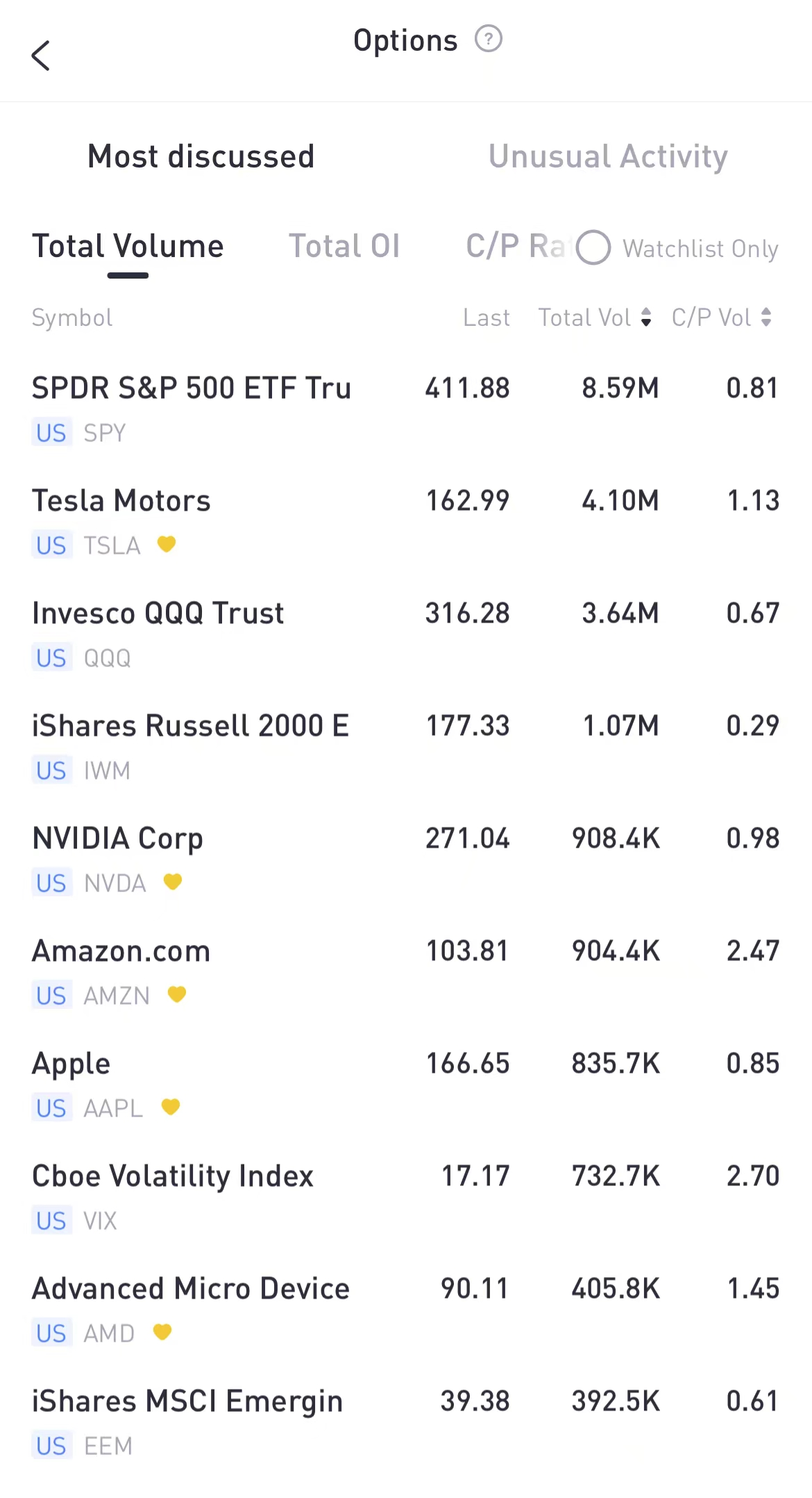 Top 10: SPY; TSLA; QQQ; IWM; NVDA; AMZN; AAPL; VIX; AMD; EEM