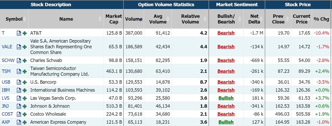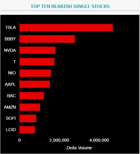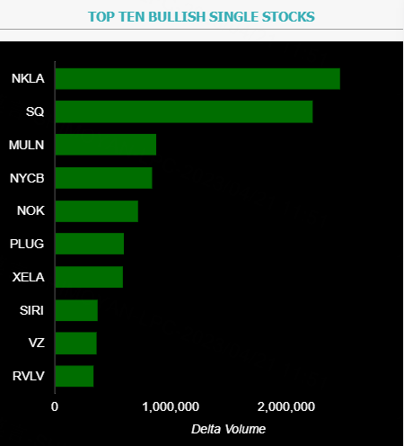 This report shows stocks with the highest volume of bullish and bearish activity by option delta volume, which converts option volume to an equivalent stock volume (bought or sold).
