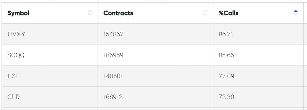 Special %Calls >70%: VIX Short-Term Futures 1.5X ETF; Nasdaq 100 Bear 3X ETF; iShares China Large-Cap ETF; SPDR Gold Shares