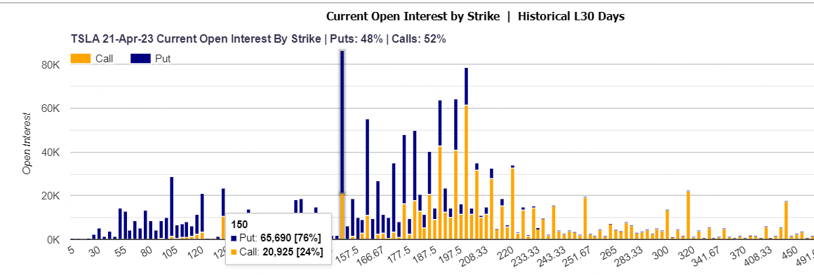 A total volume of 4.1 million options related to Tesla was traded on Thursday, up 168% from the previous trading day. A particularly high open interest was seen for the $150 strike PUT option expiring this Friday. There were 65,690 open interests in this option chain as of Thursday, which accounted for 76% of the $150 strike option expiring this Friday.