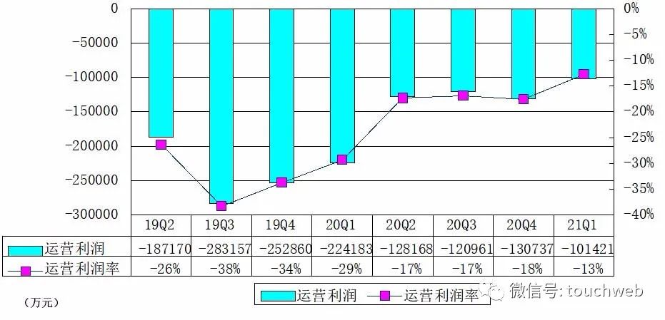 爱奇艺2021年第一季度运营亏损为10亿元(约1.548亿美元),上年同期运营亏损为22亿元;运营亏损率为13%,上年同期运营亏损率为29%。爱奇艺2021年第一季度运营利润率为-13%,自从2019年第三季度以来,爱奇艺的运营亏损在持续收窄。