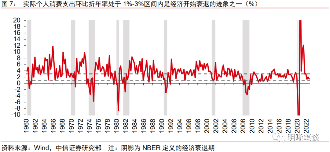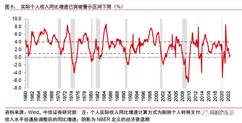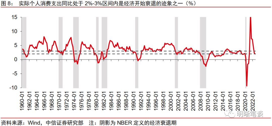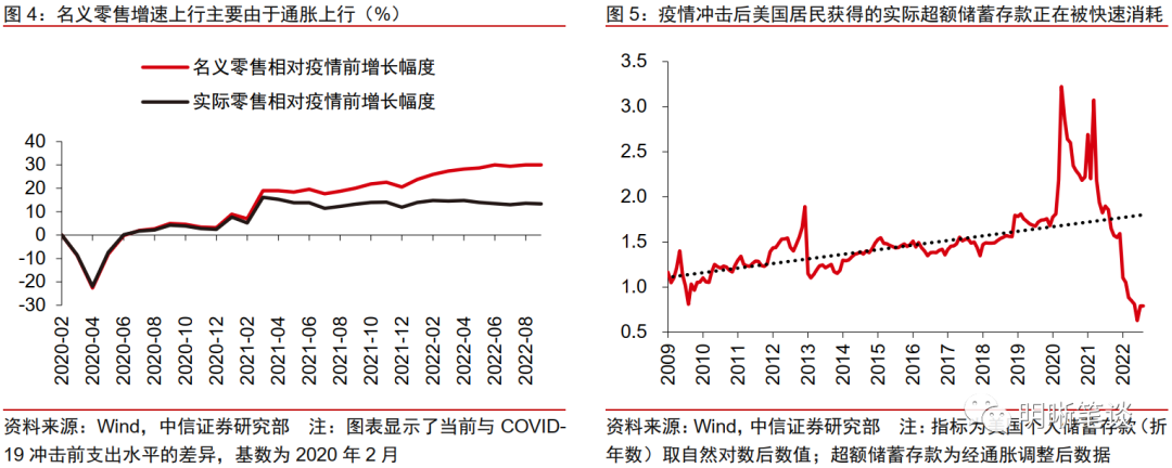 通胀持续高位运行的背景下,未来储蓄以及收入对于消费的支撑较弱,消费预计将继续疲软。实际收入增速以及实际存款增速是消费支出的核心决定因素之一,而高通胀会侵蚀居民收入水平以及储蓄水平。基于对超额储蓄的测算,疫情冲击后居民获得的超额储蓄或于四季度消耗殆尽,实际收入增速已突破警戒范围的下限,未来超额储蓄以及收入对于消费的支撑将较有限。第三季度实际个人消费支出环比折年率下滑,继续处于1%-3%的区间为经济(即将)衰退的迹象。