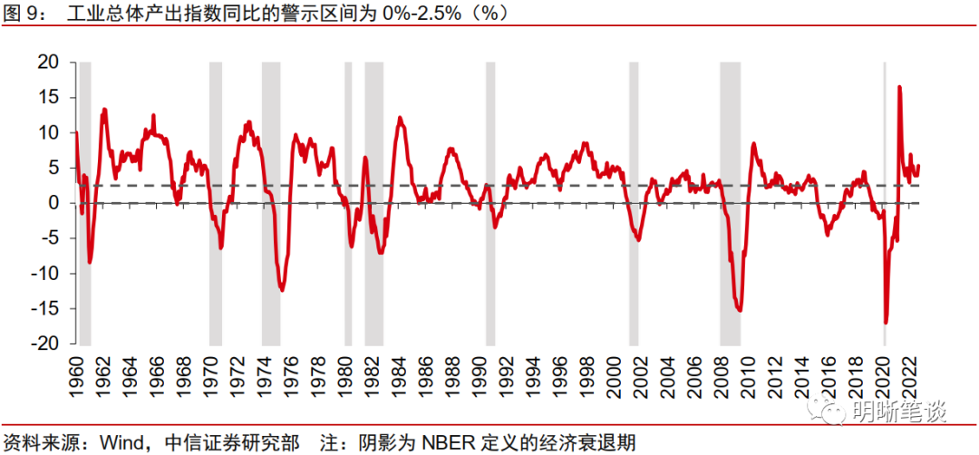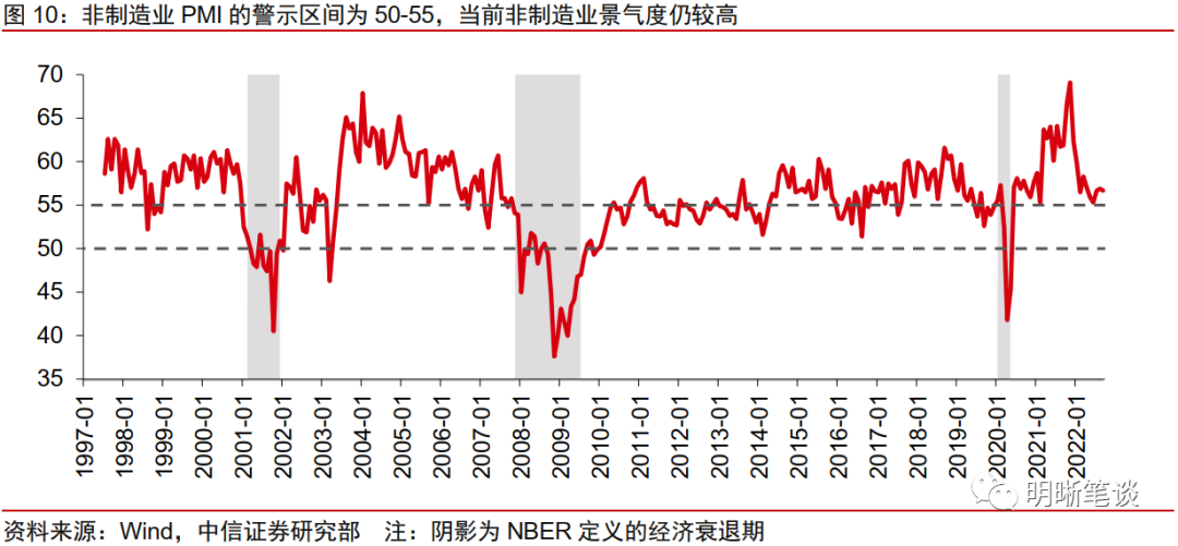 而工业、服务业相关指标还未落入警示区间,显示其发展仍具有韧性。工业总体产出指数与经济的同步性较强,往往是工业总体产出指数同比增速1至2个季度骤降至零(需后续继续下降)是经济衰退的开始的标志。但目前工业总产出增速稳定在警示区间(0%至2.5%)的上限附近,还未出现骤降迹象,相似的,非制造业PMI仍高于55。从这两个指标判断,当前经济衰退风险偏低,若工业总产出增速骤降至0以下、非制造业PMI降至50以下或反映出美国经济即将或已经步入衰退。
