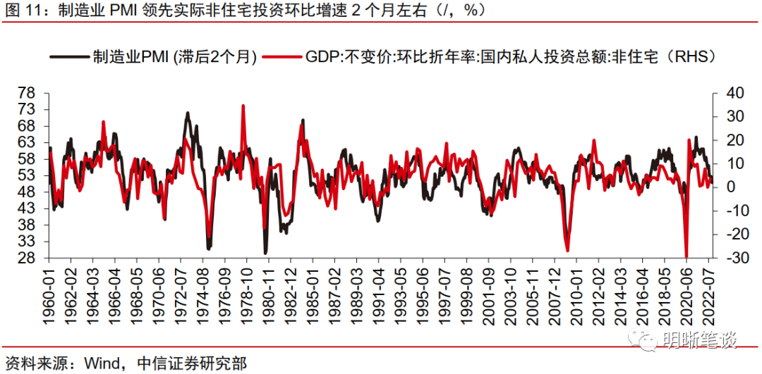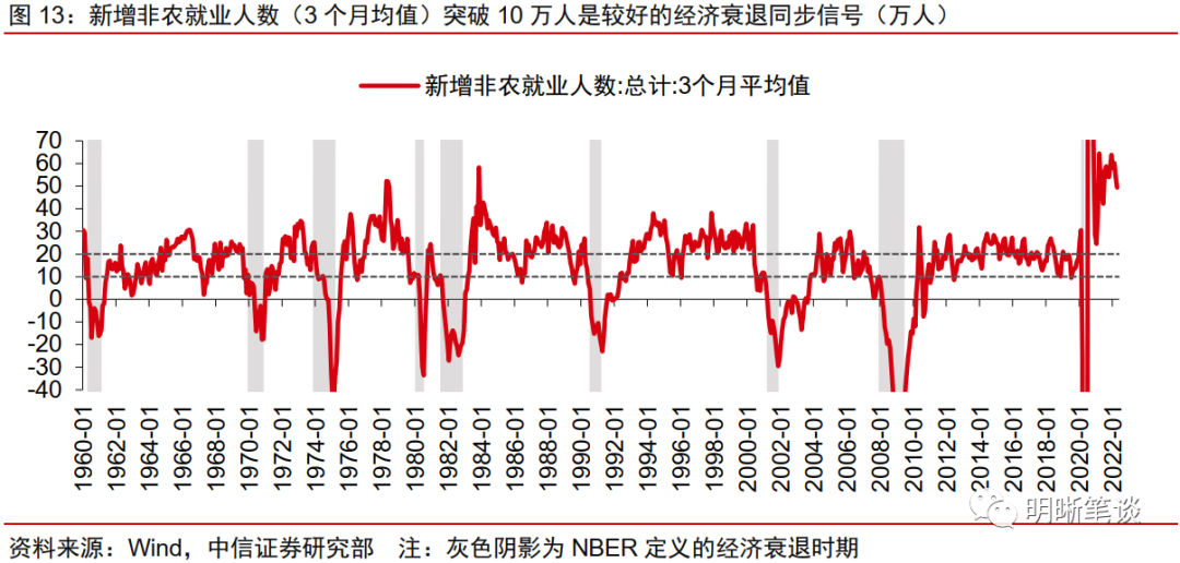 同时新增非农就业人数虽然趋弱但还未触发经济衰退的信号。新增非农就业人数下降至10至20万人的区间是一种经济衰退风险较大的迹象,而新增非农就业人数向下突破10万人(出现继续下行趋势而非震荡态势的时点)是经济衰退较为准确的同步指标。1960年以来,该信号仅在1967年误判了,指标的准确性较高并且同步性较强,该指标突破10万人时点通常略领先经济衰退,平均领先经济衰退时点1个月。9月新增非农就业人数(3个月平均)为37.17万人,离10万人还有一定的距离,短期经济衰退的可能性较小,但经济恶化会导致就业市场迅速转弱,未来非农数据存在快速恶化,出现经济衰退迹象的可能性。