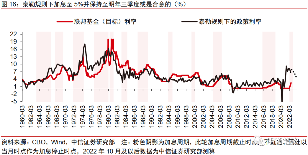 美联储或于明年一季度停止加息,加息终点或为5%左右。今年年底以及明年一季度美国经济以及劳动力市场都将面临较高的恶化风险,控制通胀或于明年一季度出现一定进展,因此若供应端没有新冲击,美联储明年一季度停止加息概率较大。从泰勒规则以及实际利率角度来看,虽然年内存在美联储加息指引再度上调的可能性,但是预计加息终点水平位于5%左右是合意的紧缩水平。