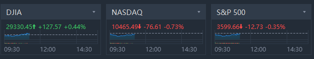 U.S. stocks mixed in morning trading. Dow Jones rose 0.44%, S&P 500 slid 0.35% while Nasdaq fell 0.73%.