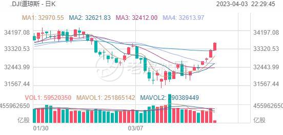 4月3日周一,美股开盘涨跌不一,道琼斯指数开盘上涨110.80点,涨幅0.33%,报33384.95点;标普500指数开盘下跌5.11点,跌幅0.12%,报4104.20点;纳斯达克综合指数开盘下跌78.08点,跌幅0.64%,报12143.82点。