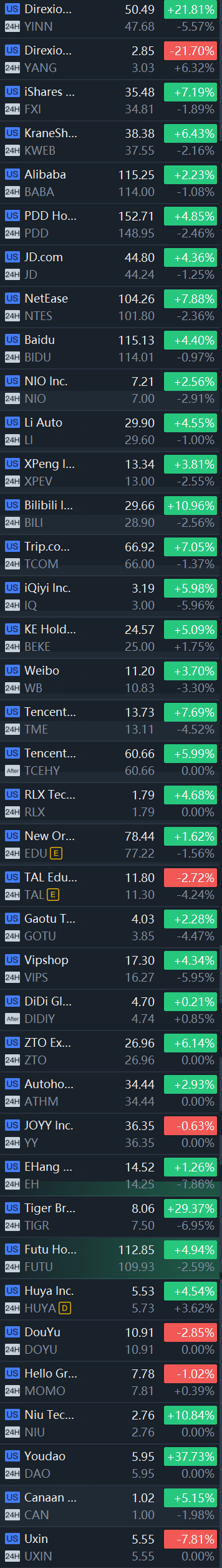 Chinese ADRs and ETFs pull back After consecutive surges. YINN fell 5.6%; FXI fell 1.9%; KWEB fell 2.2%; Alibaba fell 1.1%; PDD Holdings fell 2.5%; NetEase fell 2.4%; NIO fell 2.9%; Li Auto fell 1%; XPeng and fell 2.6%.