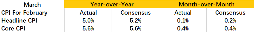 Excluding food and energy, core CPI increased 0.4% and 5.6% on an annual basis, both as expected.
