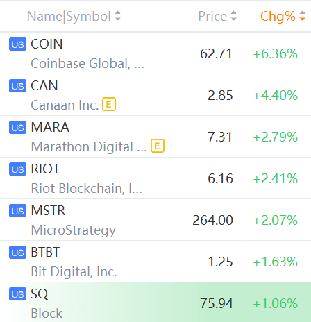 Coinbase rose over 6%; Canaan rose over 4%; Marathon Digital, Riot Blockchain rose over 2%.