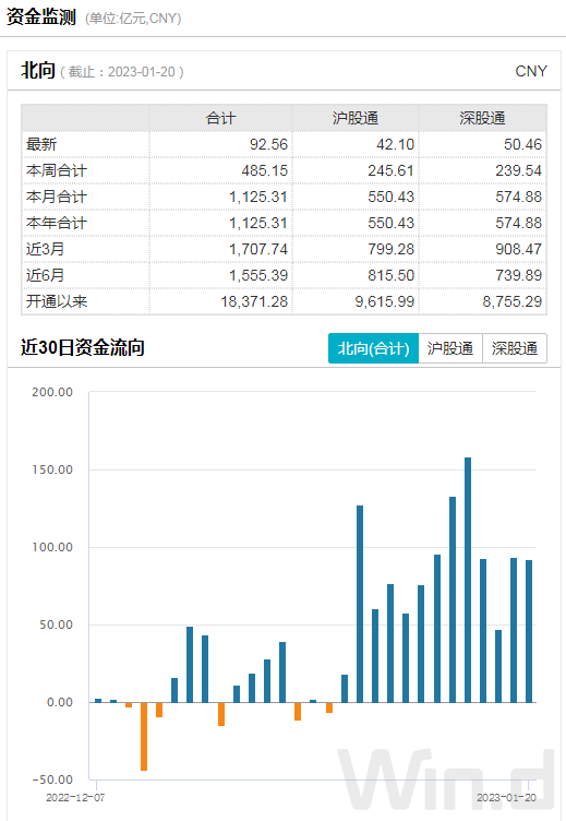据Wind数据统计,节前最后一个交易日(1月20日),北上资金净买入92.56亿元,再度逼近百亿。2023年1月以来,北上资金累计净买入1125.31亿元。