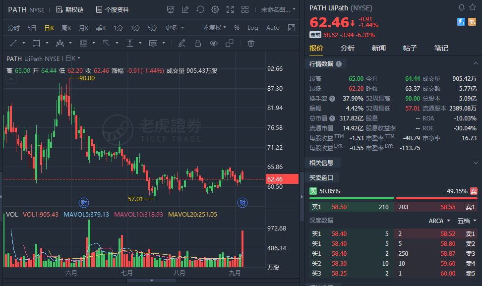 UiPath $(PATH.UK)$ shares dropped 6% in premarket trading Wednesday, following a 1.4% decline in the regular session to close at $62.46 Tuesday. Following UiPath's first earnings report as a public company about three months ago, shares fell the next day.