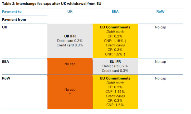 Interchange fees for purchases by British consumers from the European Union rose last year after an EU cap ended due to Britain's full departure from the bloc at the end of 2020. Fees for purchases in Britain, however, remain capped under UK rules.