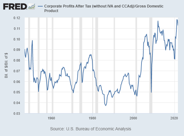 Before looking at that stock screen of the companies, check out this chart from the Federal Reserve Bank of St. Louis, showing U.S. corporate profits, relative to gross domestic product, from the beginning of 1947 through Oct. 1, 2020: