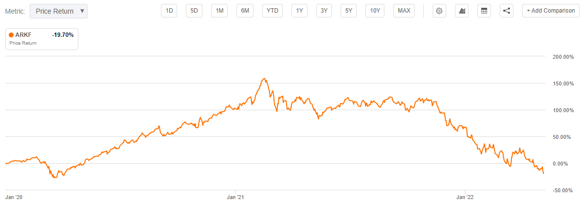 ARKF currently finds itself down 72.6% from its record high of 64.49 a share which it experienced on Feb. 16, 2021. In 2022, ARKF has underperformed, with the ETF down 57%. See below a chart of ARKF dating back to the beginning of 2020.