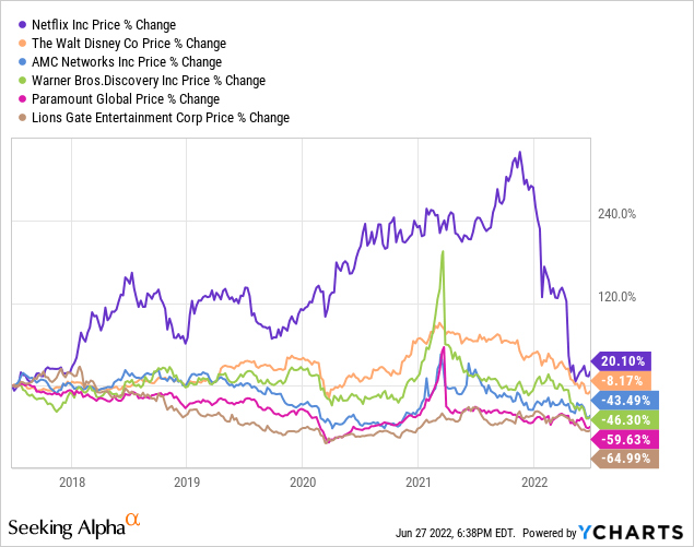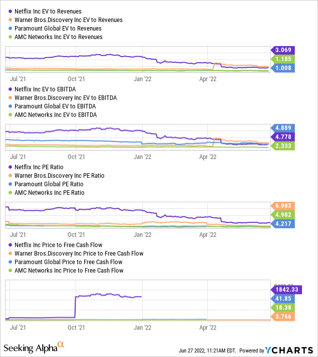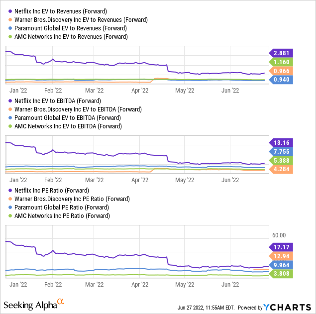 Despite NFLX now being more attractive as an investment, other players in the space could be an even better option. Having already been beaten down as streaming laggards, then by sectoral concerns related to Netflix's woes, and then by the broad market crash, valuations for Warner Bros. Discovery, Paramount Global, and AMC Networks (AMCX), appear to be pricing in extremely low expectations. Their trailing and forward EV/EBITDA and P/E ratios are generally in the mid-single digits.