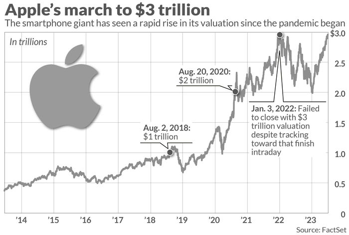 Apple's last crusade toward the milestone didn't quite succeed. While shares traded intraday on Jan. 3, 2022, at levels that would have amounted to a $3 trillion valuation at the close, the stock failed to finish there. Apple seeks to be the first U.S. company to end in $3 trillion territory.