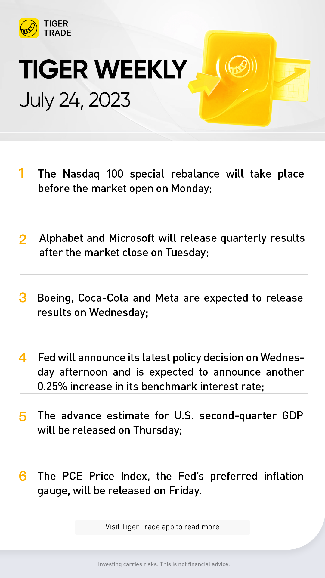 More than 150 S&P 500 companies are scheduled to report this week. Domino's Pizza will get things started on Monday, followed by Alphabet, Microsoft, Visa, General Electric, Verizon Communications, General Motors, and Waste Management on Tuesday.