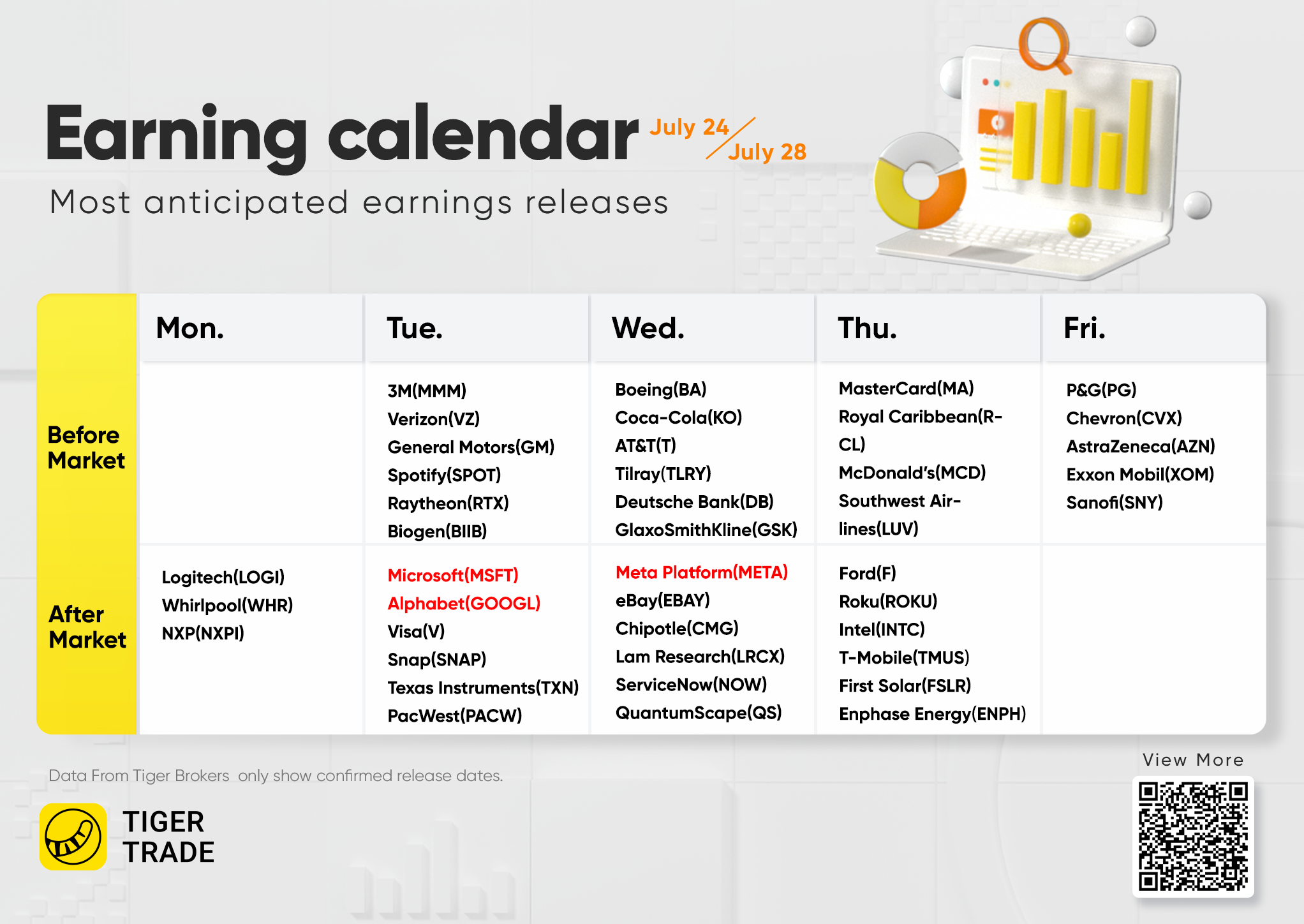 Wednesday's highlights will include Meta Platforms, Chipotle Mexican Grill, and eBay. Comcast, Southwest Airlines, Intel, American Tower, T-Mobile US, and Ford Motor report on Thursday, then Chevron, Exxon Mobil, and Procter & Gamble close the week on Friday.