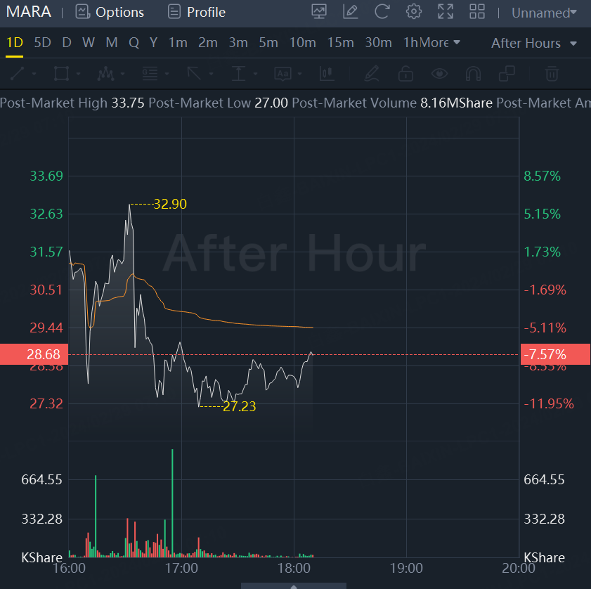 Shares of Marathon Digital were down more than 7% in Wednesday’s after-hours action, even as the bitcoin-mining company swung to a profit. The stock has risen 74% over the past month and 151% over the past three months as bitcoin prices have surged.