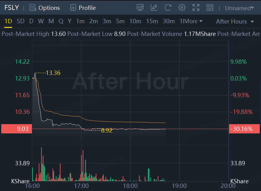 Fastly was down 30.2% in after-hours trading to $9.03. That would be a 52-week low it if holds in regular trading on Thursday.