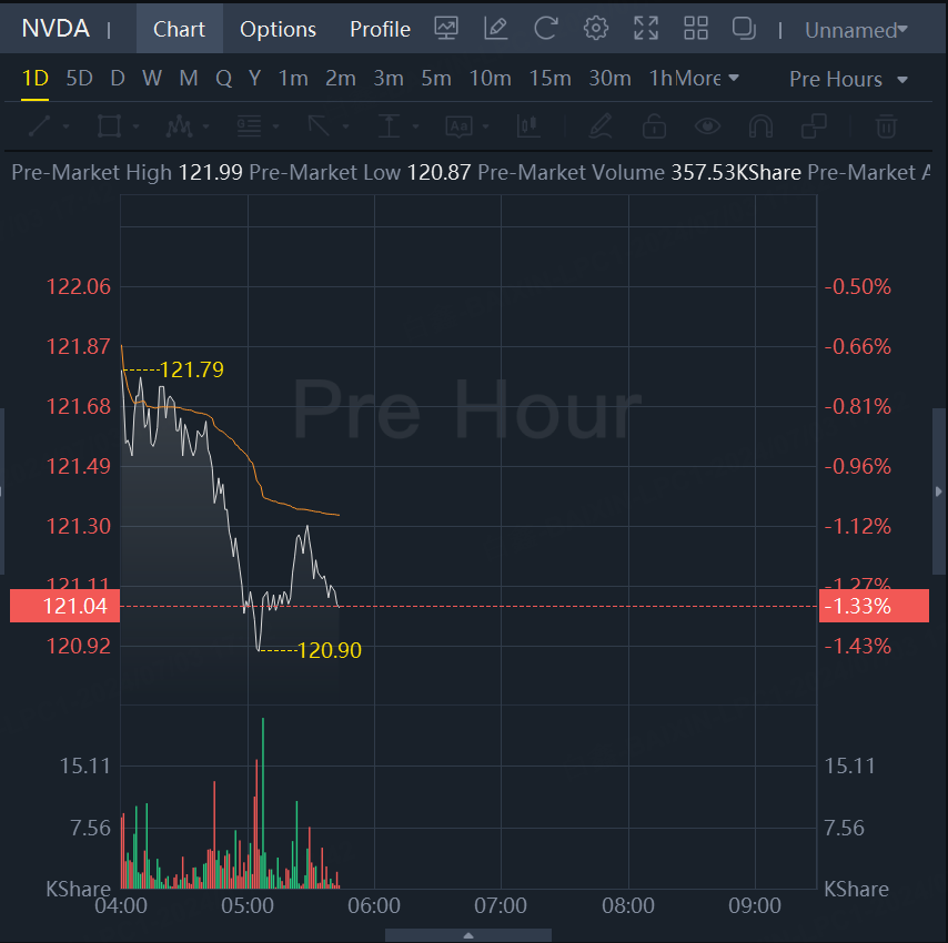 Nvidia shares were down 1.3% at $121.04 in premarket trading. The stock closed down 1.3% on Tuesday.