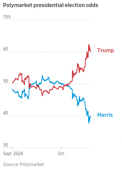 Over the past two weeks, the chances of a Trump victory in the November election have surged on Polymarket, a crypto-based prediction market. Its bettors were giving Trump a 62% chance of winning on Thursday, while Harris's chances were 38%. The candidates were in a dead heat at the start of October.