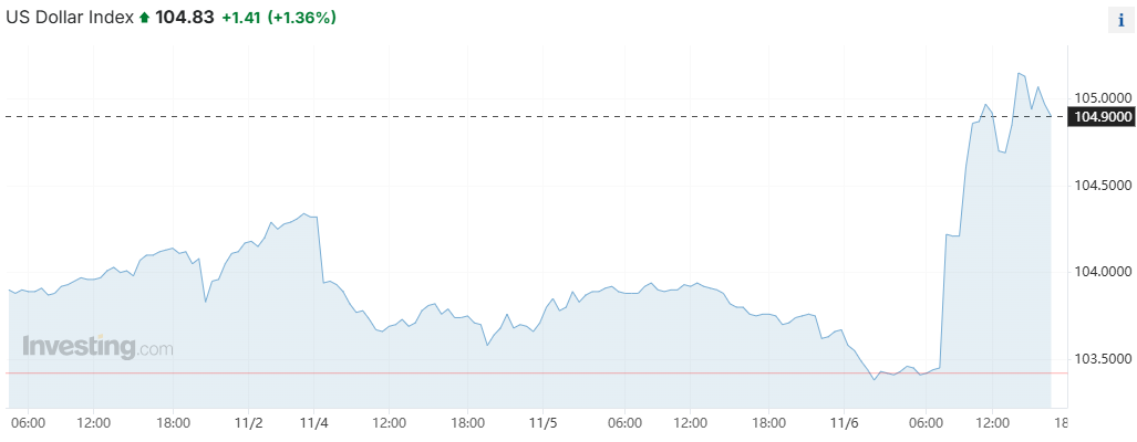 华尔街策略师普遍认为,特朗普的关税政策至少在短期内会支撑美元,损害墨西哥比索等货币。美元指数涨幅扩大至1.36%,报104.83,为7月份来新高。在美元上涨的压力下,亚洲市场石油、大豆和铜价格分别下跌约1.5%和2%以上。包括黄金在内的贵金属价格保持稳定。