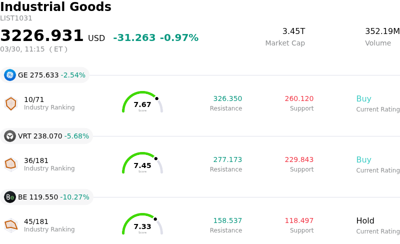 Caterpillar Inc (CAT) moved down by 3.82%. The Industrial Goods sector is down by 0.97%. The company underperformed the industry. Top 3 stocks by turnover in the sector: General Electric Co (GE) down 2.54%; Vertiv Holdings Co (VRT) down 5.68%; Bloom Energy Corp (BE) down 10.27%.