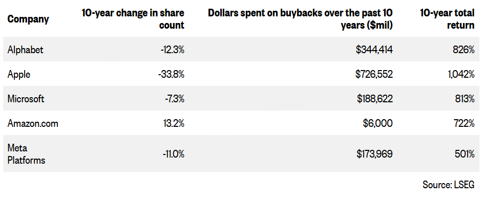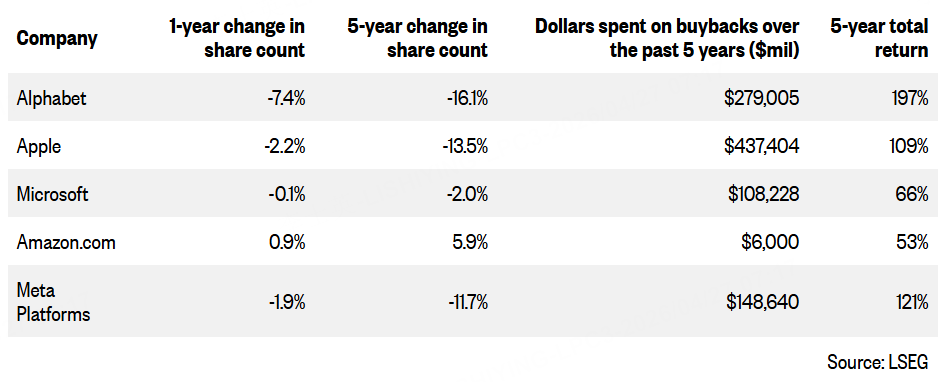 Here is a look back at how much the five Big Tech companies reporting results next week have spent on stock buybacks over the past five years and how much their share counts have changed, followed by separate data to show what they have done over the past 10 years. The companies are sorted by market capitalization.