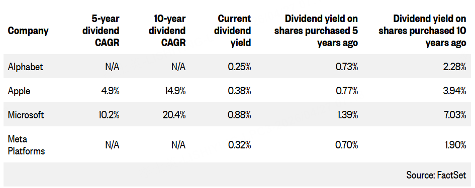 For Alphabet and Meta, there are no dividend CAGRs because both companies started to pay quarterly dividends in 2024.