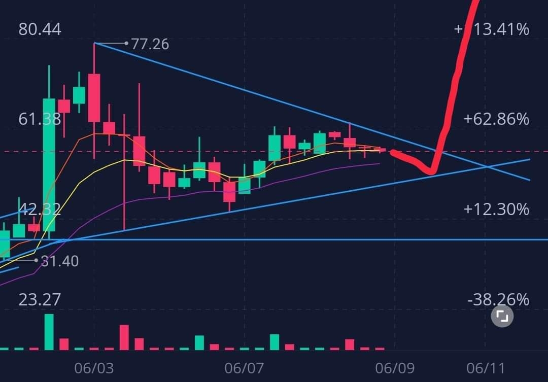 AMC has been in a consolidation period since last Tuesdays big run up. As the symmetrical triangle comes to a close the price will break out up or potentially down. Tomorrow looks like it will be a down day until we bounce off the support level. IF we get a good bounce off the support we could break out up to the next level. A break out is typically the length of the flag pole, which should take the price up to around 88-90 dollar range. This is what big money will be waiting to see before they buy in. So we need to see LOTS of buying power when the price meets that level of support for the bounce.