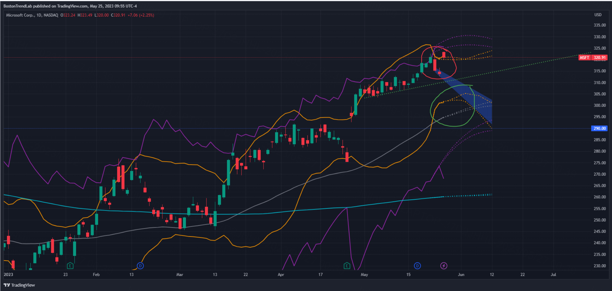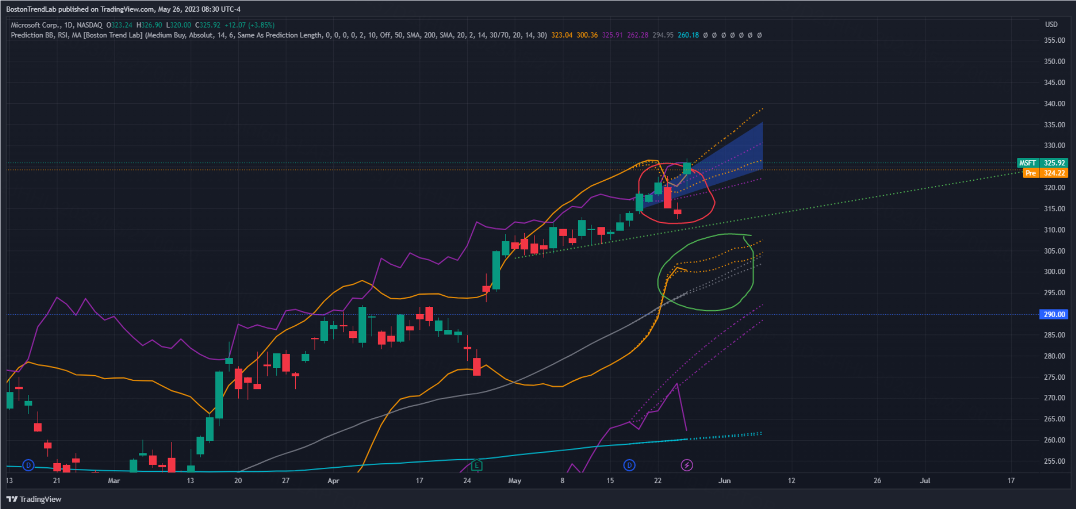 With an astonishing turn of events, we closed yesterday with a green candle, brushing against the 70 level of the 14-day RSI (purple line, inverted RSI). If today we manage to close with a red candle, but still above 320, for example, opening at 324 and closing at 320.5, and if we can sustain this level in the following days without any irrational breakout, allowing the stock to settle, then it is possible that the agreement on raising the debt ceiling can push the price up to 330 next week and potentially even up to 343 from there.