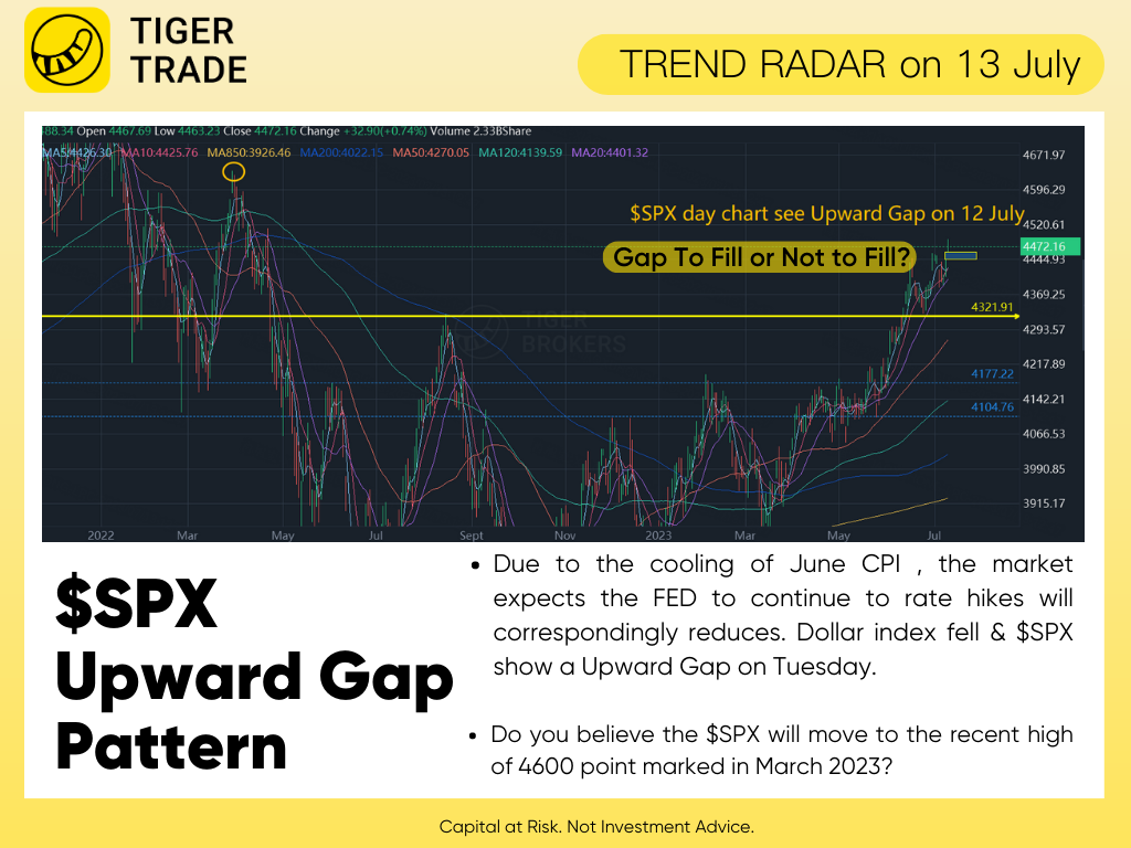 What a upward gap mean to the market?The gap will be filled or not fill?Will $S&P 500(.SPX)$ move to March high around 4600 points area due to Q223 earnings results? How to plan the following trades?bullish or bearish?please read to the bottom and share your personal comments to win Tiger Coins.