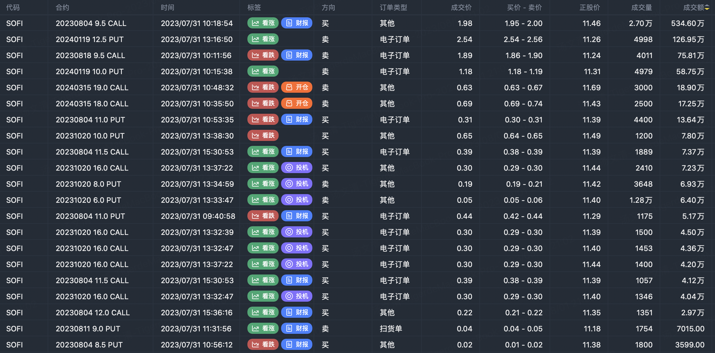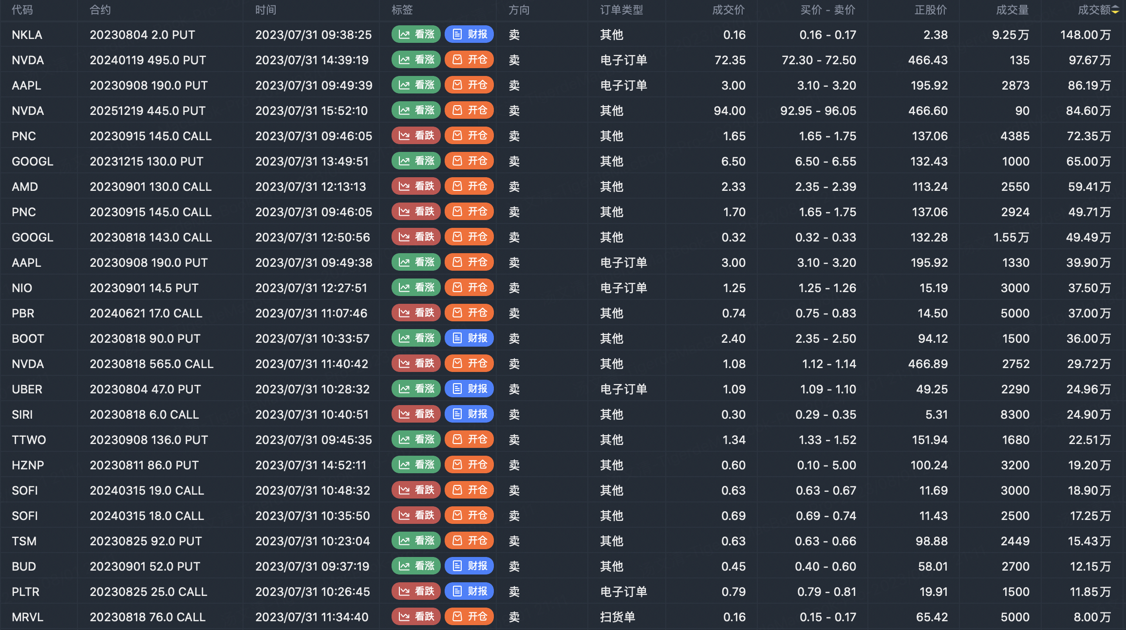 Note: This image data is from Tiger PC. This screen is a significant sell open position for an option contract in the market. A sell of a call option means that the trader believes that the underlying trend has peaked, and a sell of a put option means that the trader believes that the underlying trend has bottomed. These contract openings typically indicate significant activity in the underlying stock, including whether the trader is willing to accumulate a long or short option position.