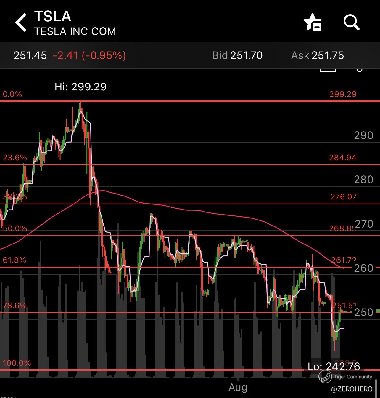 By using the Fibonacci retracement tool, we can identify that 250 is a strong magnet to draw the share price lower. Ever since their earnings call in July, share price has dived steeply as the market loves to sell the news on Tesla without fail. If one follows Tesla long enough, it's wise to buy the rumour leading to earnings with Elon's pump and then sell it just before their reporting.
