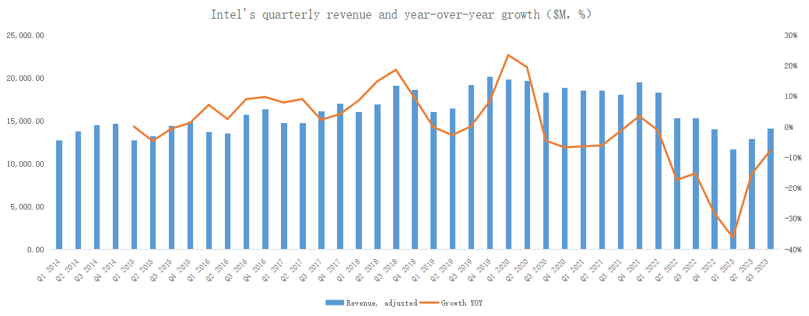 Specifically, Intel's revenue in the third quarter was $14.158 billion, down 7.7% year-on-year, exceeding analyst expectations of $13.54 billion, and exceeding the 13.9 billion revenue ceiling given by management: