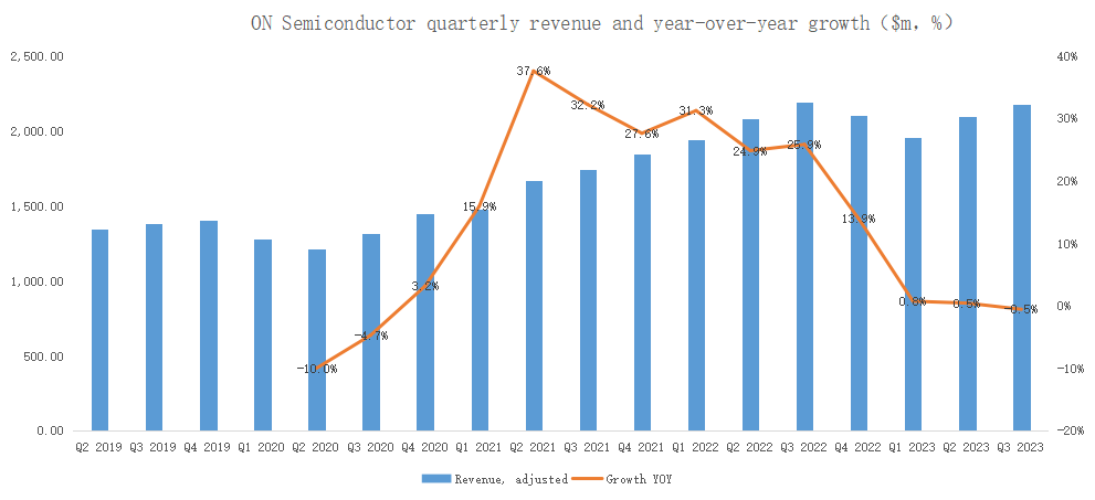 Specifically, revenue of ON Semiconductor in the third quarter was $2.18 billion, down 0.5% year-on-year, exceeding analyst expectations of $2.147 billion, and approaching the upper limit of the guidance:
