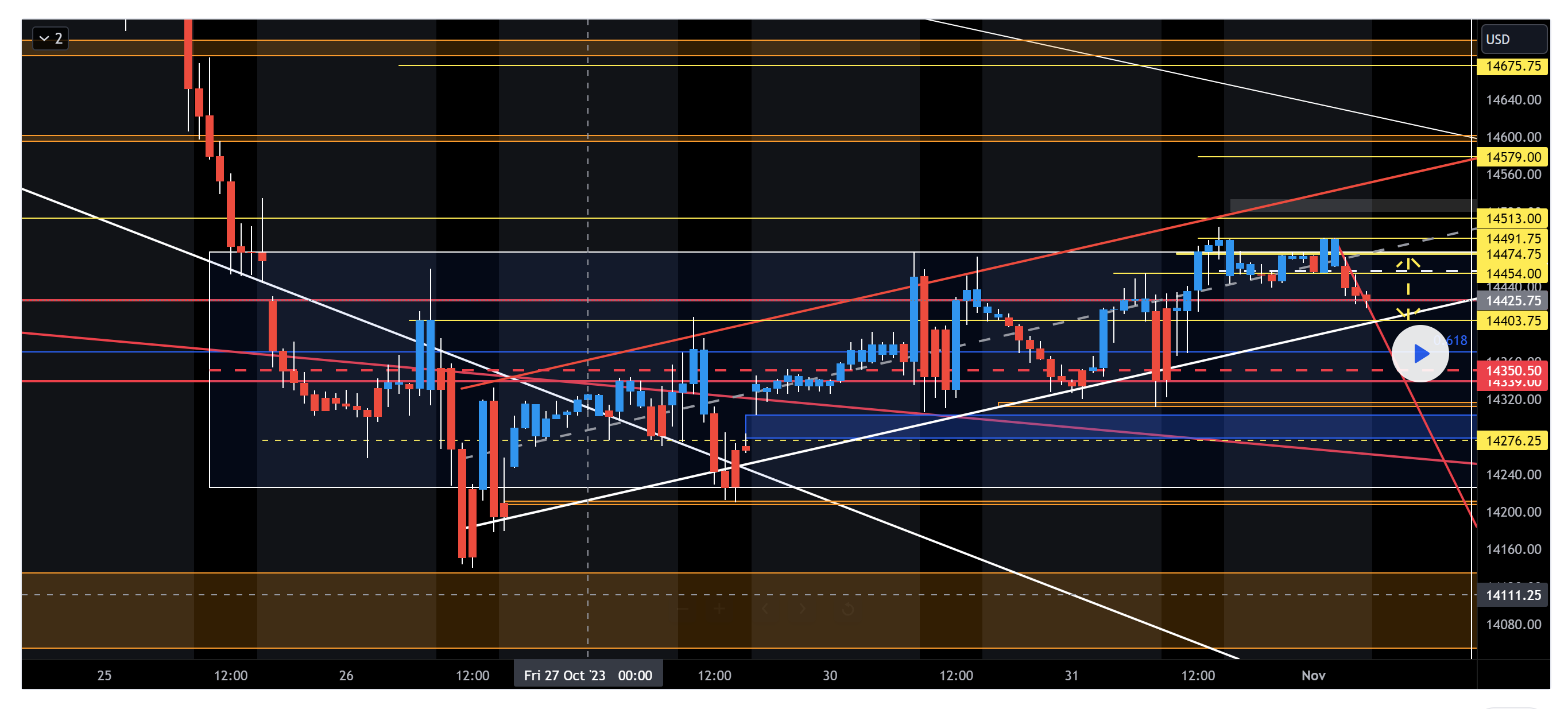 FED Day, I normally do not trade, though I would pass along. Just keep in mind that the prior two day lift was weak and did have much O/N help with a Sunday Gap Open, may be just another "Air Pocket", Drop Offset prop job and will have to bounce hard off something to take out recent highs. We do have a huge FA below at 14125. Drop/Pop could be in play or this could be a Long Trap from past 2-3 days.