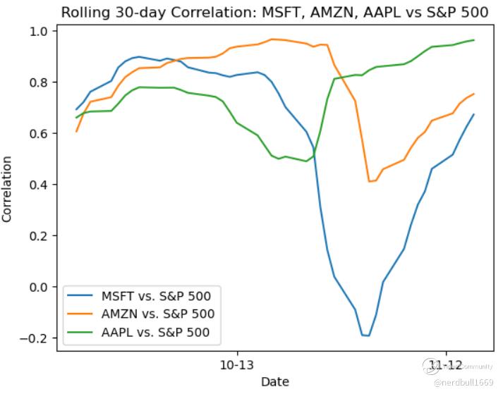 If we were to compare the correlation between these 3 stocks and S&P 500, Apple seem to have the closest relationship with S&P 500 as its score is close to 1.0, Amazon and Microsoft might not have such close relationship, but we can see that it is increasing.