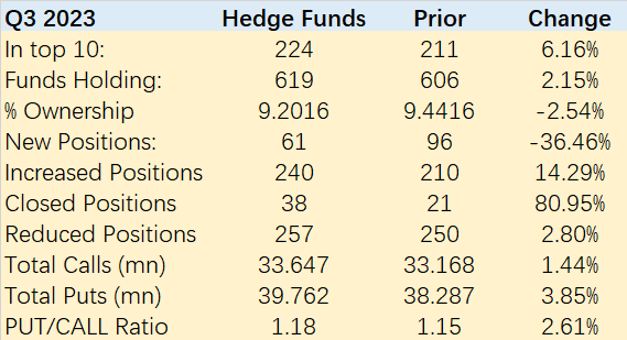 In the just-concluded Q3, hedge funds also demonstrated continued enthusiasm for NVDA in their 13F filings, with a 6% increase in weight among the top ten holdings and a 2% increase in funds holding positions.
