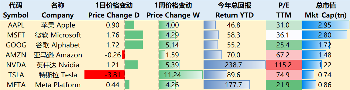 The largest increase was $Tesla Motors(TSLA)$ +11.24%, which was the only decline last week but soared this week; followed by $NVIDIA Corp(NVDA)$ +5.39%, $Alphabet(GOOGL)$ +5.14%, $Microsoft(MSFT)$ +4.29%, $Meta Platforms, Inc.(META)$ +4.26%, $Apple(AAPL)$ +4.00%, and $Amazon.com(AMZN)$ +1.59%.