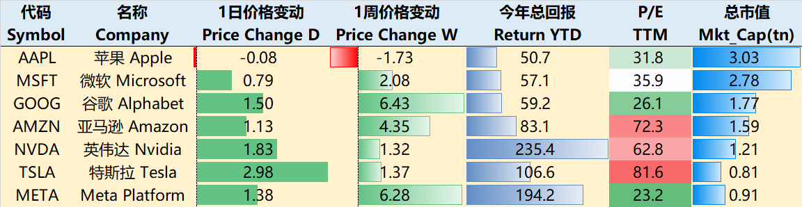 As of the close on December 21st, the performance of major technology companies in the past week showed the following changes: $Alphabet(GOOGL)$ $Alphabet(GOOG)$ +6.43%, $Meta Platforms, Inc.(META)$ +6.28%, $Amazon.com(AMZN)$+4.35%, $Microsoft(MSFT)$ +2.08%, and $NVIDIA Corp(NVDA)$ +1.32%, $Tesla Motors(TSLA)$ +1.37%, $Apple(AAPL)$ -1.73%.