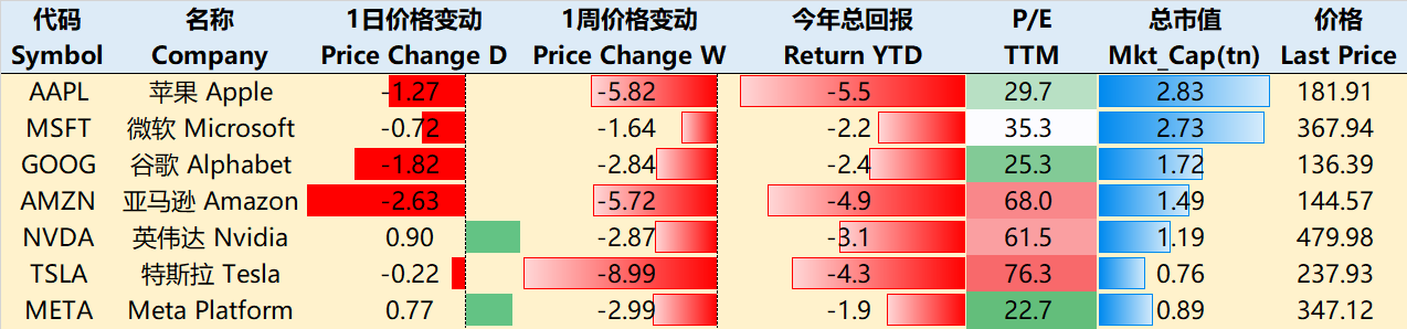 As of the close on January 4th, big tech stocks experienced varying degrees of pullback over the past week. Among them, $Tesla Motors(TSLA)$ had the largest decline at -8.99%, followed by $Apple(AAPL)$ at -5.82%, $Amazon.com(AMZN)$ at -5.72%, $Meta Platforms, Inc.(META)$ at -2.99%, $Alphabet(GOOG)$ $Alphabet(GOOGL)$ at -2.84%, and $Microsoft(MSFT)$ at -1.64%.