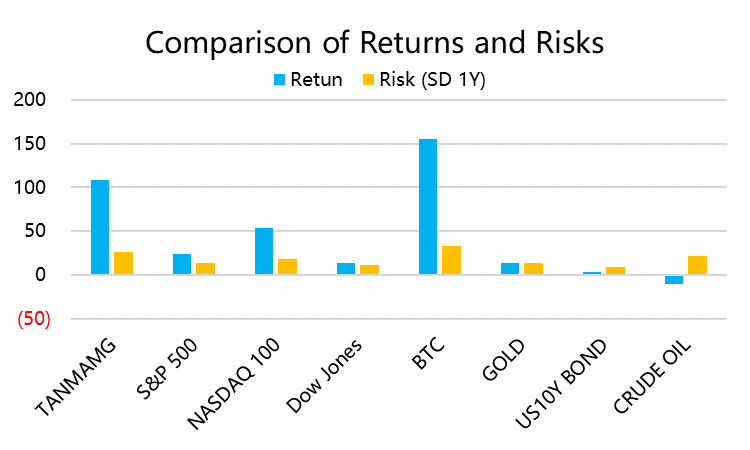 Compared to other asset classes, the portfolio's return of 108.99% is second only to BTC, but in terms of unit risk return, it is also leading compared to other stock indices, oil, gold, and bonds.