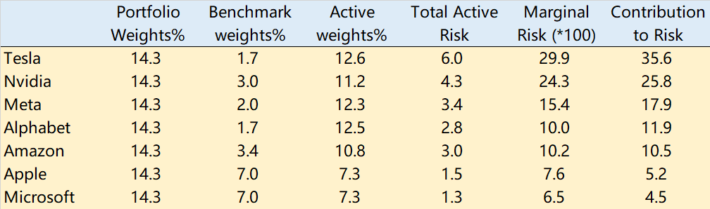 Looking at the component stocks, since the portfolio is equally weighted, this means that compared to the benchmark, TSLA, META, NVDA, and AMZN bring a relatively large active weight. Therefore, the risk (volatility) brought by individual stocks is also greater, with Tesla being the main source of volatility.