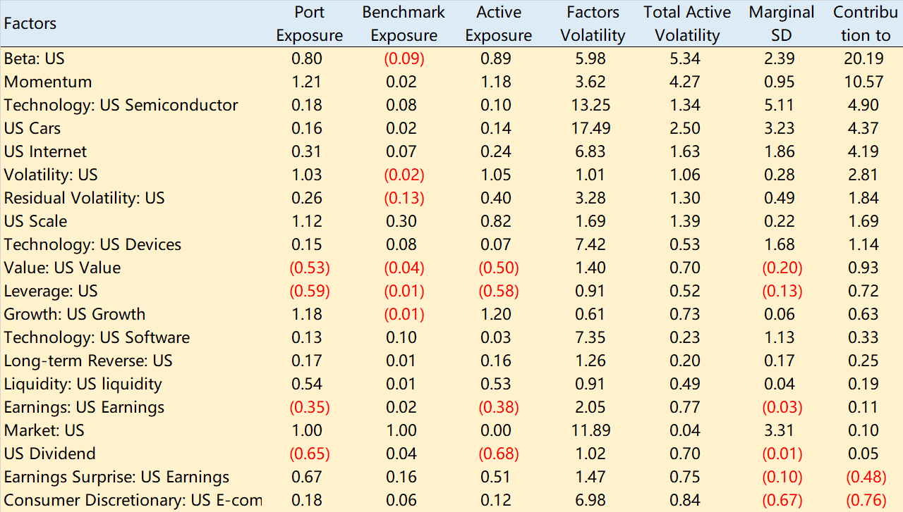 In terms of factor risk, high marginal risks include semiconductors, U.S. automotive, market beta, while high contributions come from beta and momentum, which is clearly a double-edged sword.